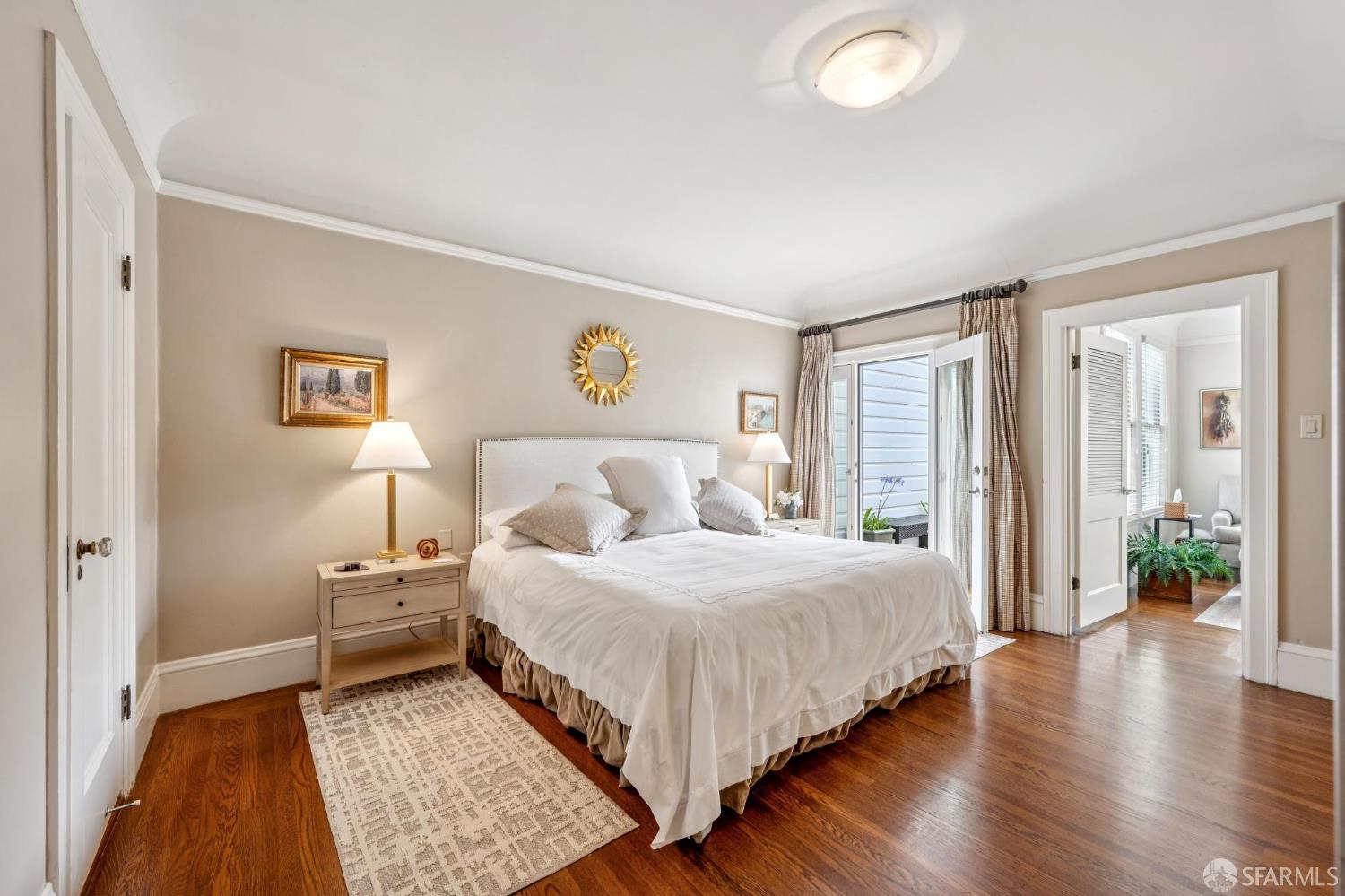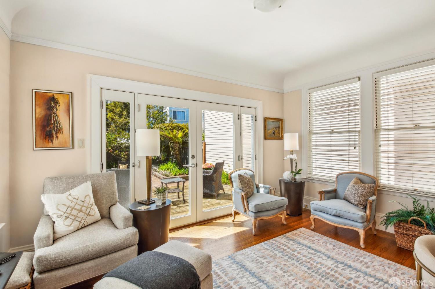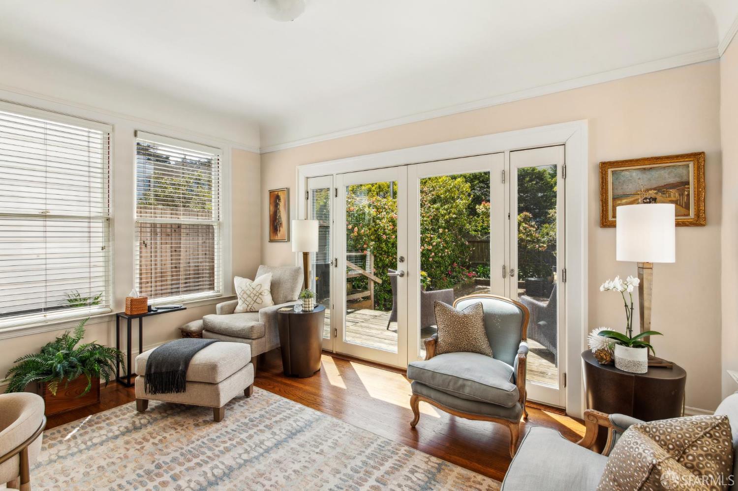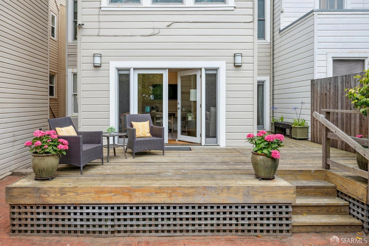 Less than a block from GG Park, this elegant full-floor Edwardian condo w/ additional room & bathroom downstairs offers timeless charm, thoughtful updates & grand scale. Anchored by floor-to-ceiling Palladian windows, the living room is a showpiece of elegance and space. A formal dining room opens to the updated kitchen with granite countertops, a breakfast bar, Thermador range, refrigerator, dishwasher, ample cabinet & pantry storage. Off the kitchen, a dedicated laundry room has w/d & a wine fridge. A nearby guest bathroom completes the central living space. Tucked at the rear of the home, 2 bedrooms each connect to a bright, versatile sunroom. Both the sunroom & the adjoining primary suite open directly to a private deck & the shared landscaped backyard. The primary bedroom also includes built-in closets and an ensuite bath, while the 2nd bedroom has a generous walk-in closet. Downstairs, a 3rd room and bathroom offer separation for guests or a private workspace. This level also has a deeded storage room & 1-car garage parking. The two-unit building has been thoughtfully maintained. Set along the Park Presidio greenbelt, this home is perfectly positioned w/ abundant street parking & quick access to GG Park, Balboa, Clement & Geary Streets.