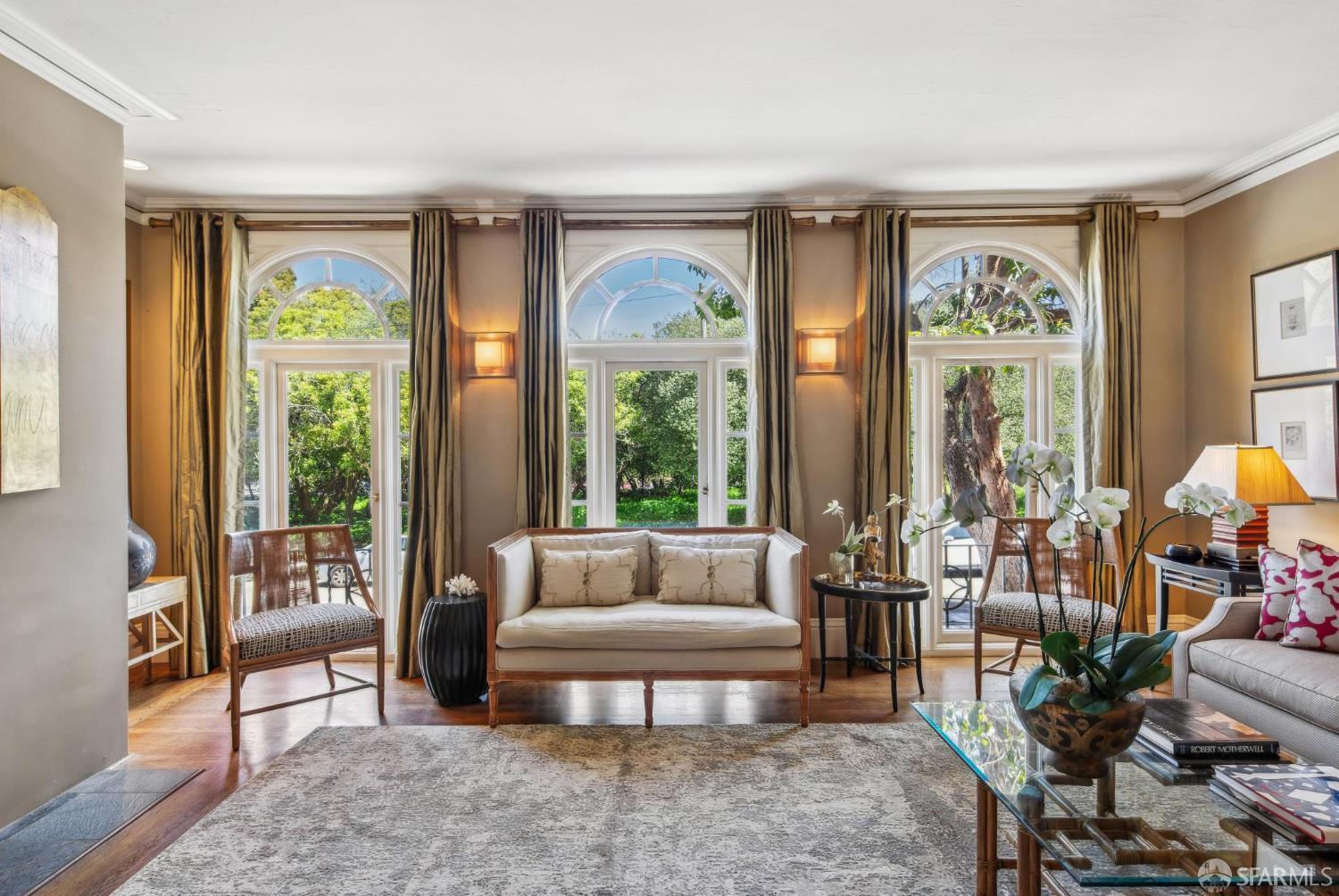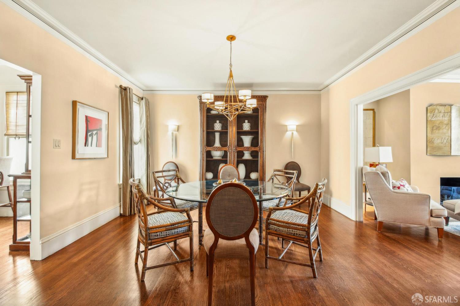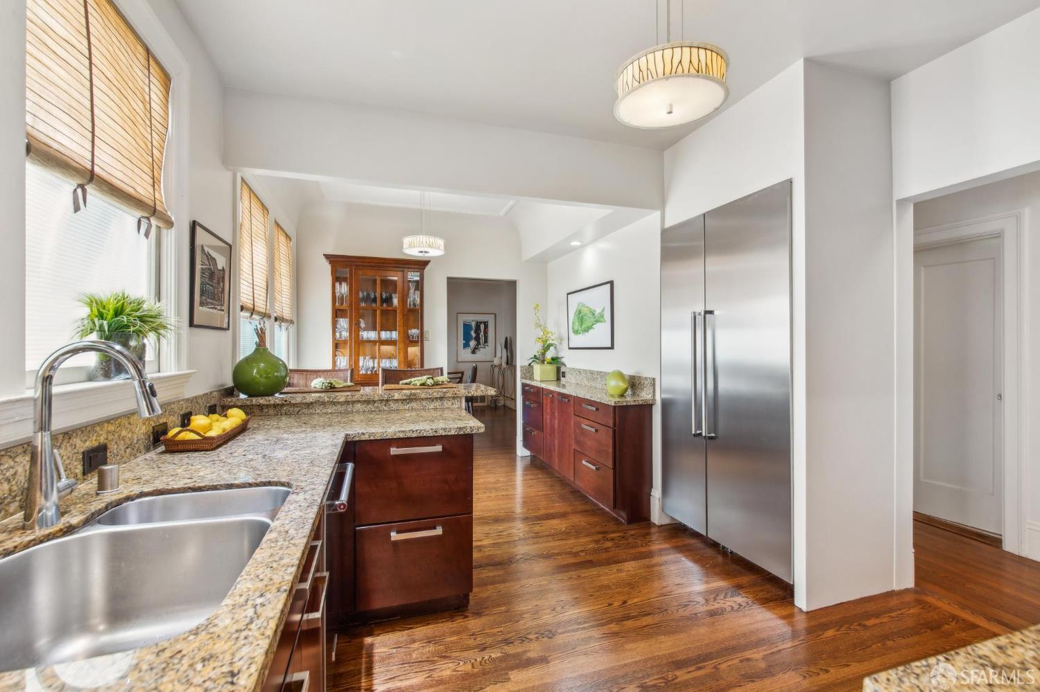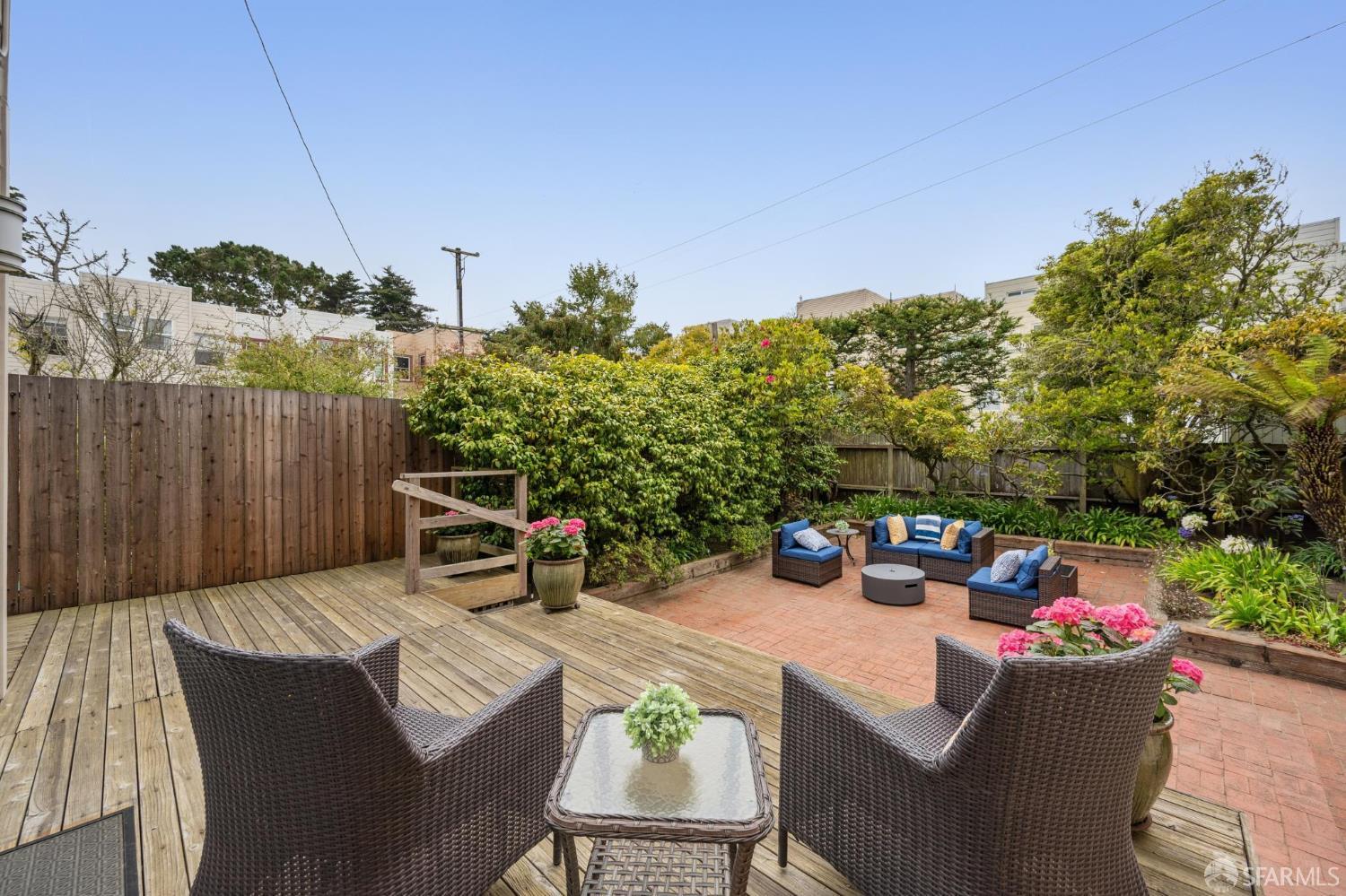 Less than a block from GG Park, this elegant full-floor Edwardian condo w/ additional room & bathroom downstairs offers timeless charm, thoughtful updates & grand scale. Anchored by floor-to-ceiling Palladian windows, the living room is a showpiece of elegance and space. A formal dining room opens to the updated kitchen with granite countertops, a breakfast bar, Thermador range, refrigerator, dishwasher, ample cabinet & pantry storage. Off the kitchen, a dedicated laundry room has w/d & a wine fridge. A nearby guest bathroom completes the central living space. Tucked at the rear of the home, 2 bedrooms each connect to a bright, versatile sunroom. Both the sunroom & the adjoining primary suite open directly to a private deck & the shared landscaped backyard. The primary bedroom also includes built-in closets and an ensuite bath, while the 2nd bedroom has a generous walk-in closet. Downstairs, a 3rd room and bathroom offer separation for guests or a private workspace. This level also has a deeded storage room & 1-car garage parking. The two-unit building has been thoughtfully maintained. Set along the Park Presidio greenbelt, this home is perfectly positioned w/ abundant street parking & quick access to GG Park, Balboa, Clement & Geary Streets.