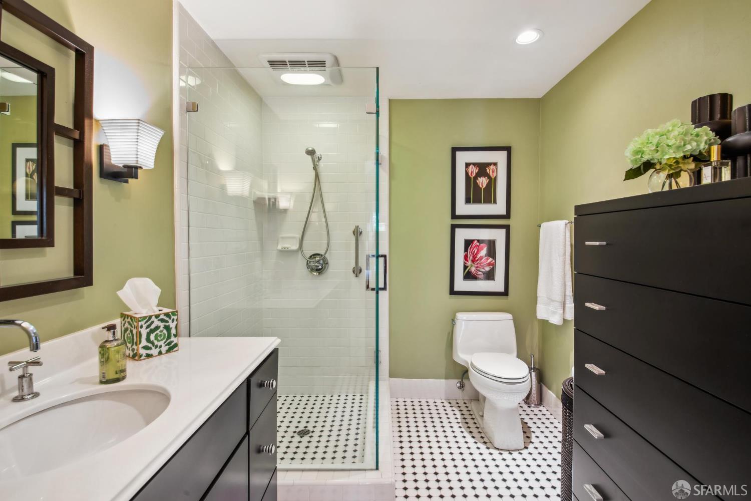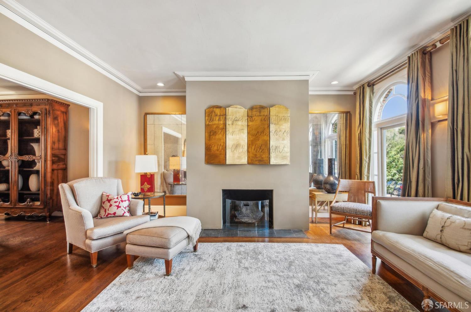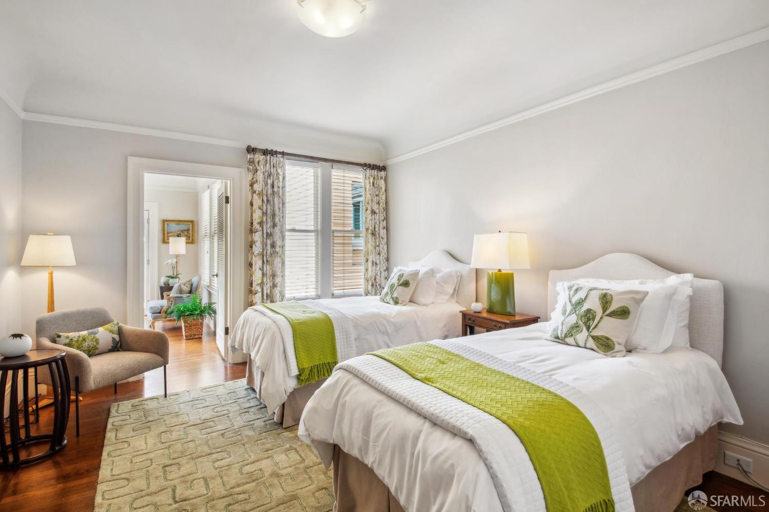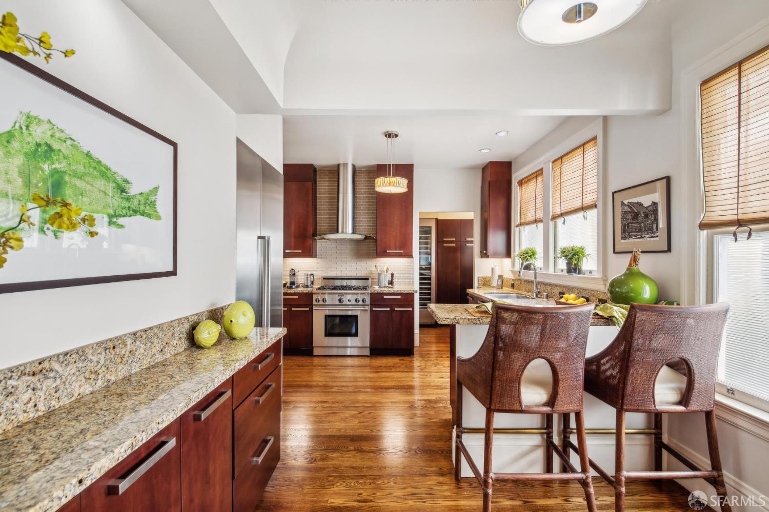 Less than a block from GG Park, this elegant full-floor Edwardian condo w/ additional room & bathroom downstairs offers timeless charm, thoughtful updates & grand scale. Anchored by floor-to-ceiling Palladian windows, the living room is a showpiece of elegance and space. A formal dining room opens to the updated kitchen with granite countertops, a breakfast bar, Thermador range, refrigerator, dishwasher, ample cabinet & pantry storage. Off the kitchen, a dedicated laundry room has w/d & a wine fridge. A nearby guest bathroom completes the central living space. Tucked at the rear of the home, 2 bedrooms each connect to a bright, versatile sunroom. Both the sunroom & the adjoining primary suite open directly to a private deck & the shared landscaped backyard. The primary bedroom also includes built-in closets and an ensuite bath, while the 2nd bedroom has a generous walk-in closet. Downstairs, a 3rd room and bathroom offer separation for guests or a private workspace. This level also has a deeded storage room & 1-car garage parking. The two-unit building has been thoughtfully maintained. Set along the Park Presidio greenbelt, this home is perfectly positioned w/ abundant street parking & quick access to GG Park, Balboa, Clement & Geary Streets.