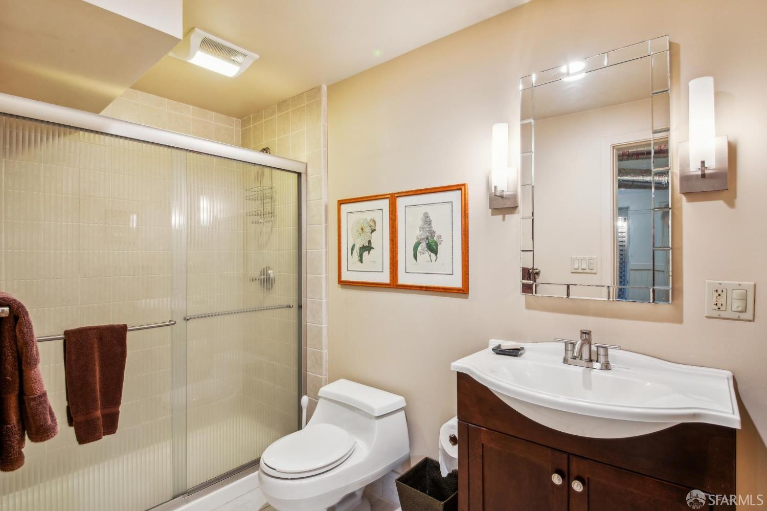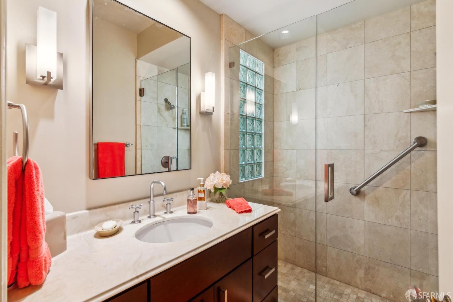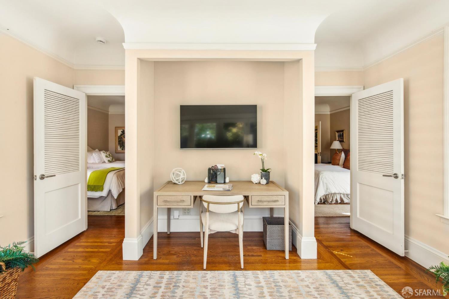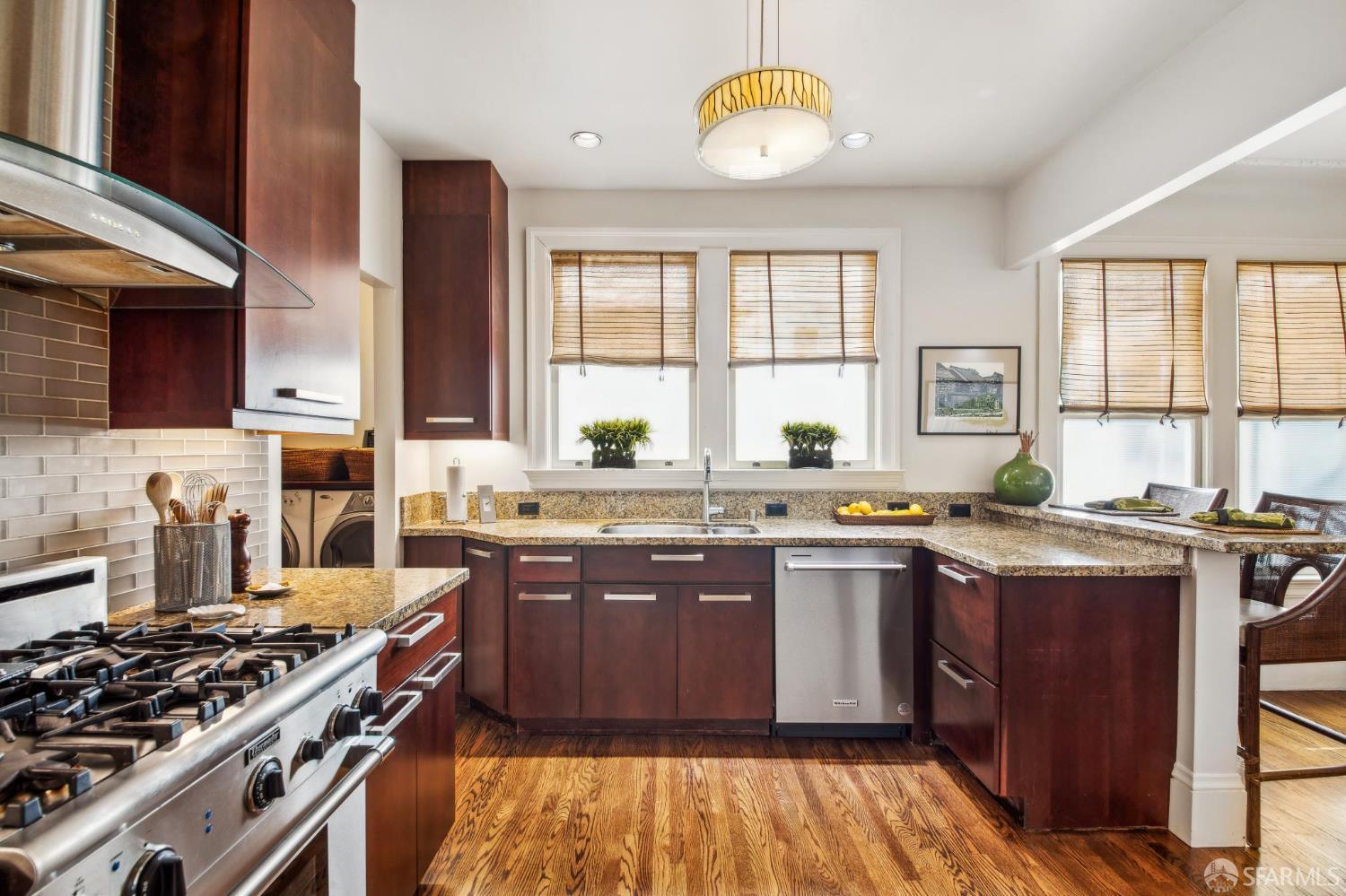 Less than a block from GG Park, this elegant full-floor Edwardian condo w/ additional room & bathroom downstairs offers timeless charm, thoughtful updates & grand scale. Anchored by floor-to-ceiling Palladian windows, the living room is a showpiece of elegance and space. A formal dining room opens to the updated kitchen with granite countertops, a breakfast bar, Thermador range, refrigerator, dishwasher, ample cabinet & pantry storage. Off the kitchen, a dedicated laundry room has w/d & a wine fridge. A nearby guest bathroom completes the central living space. Tucked at the rear of the home, 2 bedrooms each connect to a bright, versatile sunroom. Both the sunroom & the adjoining primary suite open directly to a private deck & the shared landscaped backyard. The primary bedroom also includes built-in closets and an ensuite bath, while the 2nd bedroom has a generous walk-in closet. Downstairs, a 3rd room and bathroom offer separation for guests or a private workspace. This level also has a deeded storage room & 1-car garage parking. The two-unit building has been thoughtfully maintained. Set along the Park Presidio greenbelt, this home is perfectly positioned w/ abundant street parking & quick access to GG Park, Balboa, Clement & Geary Streets.